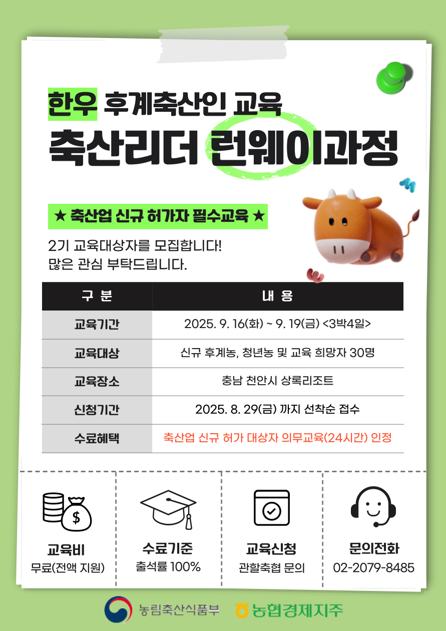 후계축산인 및 신규 창업농을 대상으로 축산업 신규 허가 대상자 의무교육과정 (24시간)이 인정되는 `25년 후계축산인교육 '축산리더 런웨이 과정' 2기 교육생 모집 안내를 드립니다.