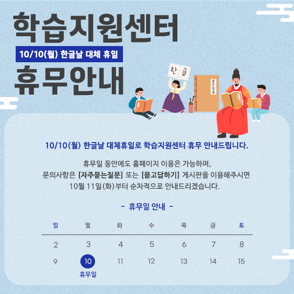 한글날 대체휴일로 인하여 학습지원센터도 휴무임을 안내드립니다.