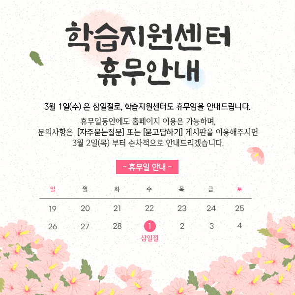 삼일절 연휴로 학습지원센터도 휴무임을 안내드립니다.