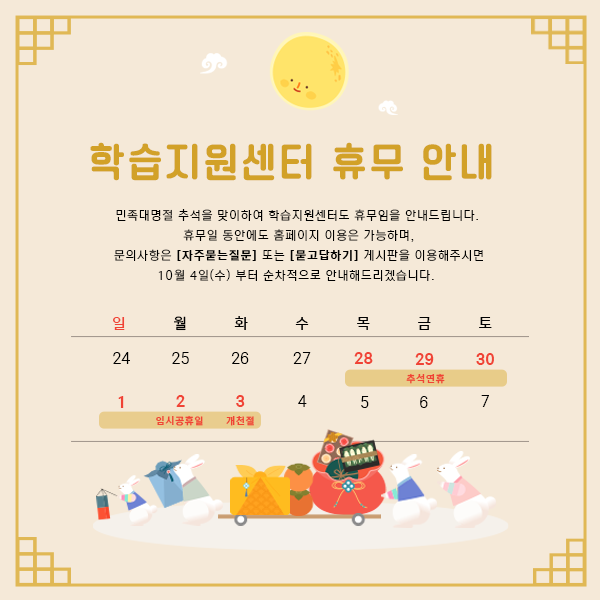 아래 안내드리는 연휴 기간동안 학습지원센터도 휴무임을 안내드립니다.