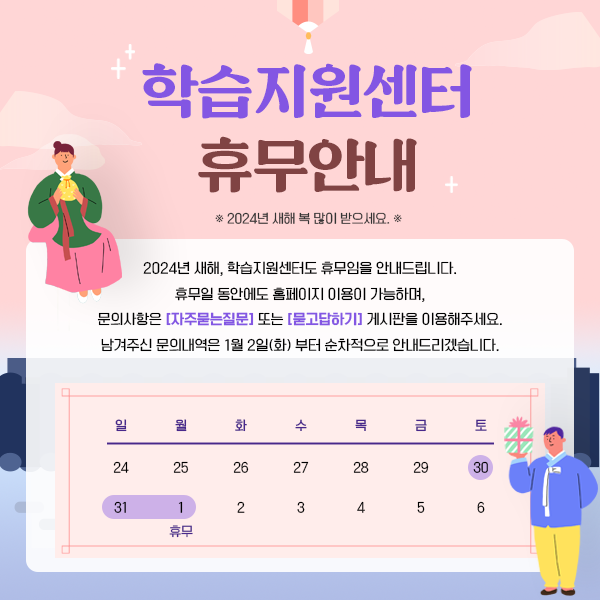 2024년 새해를 맞이하여 연휴기간 동안 학습지원센터도 휴무임을 안내드립니다.