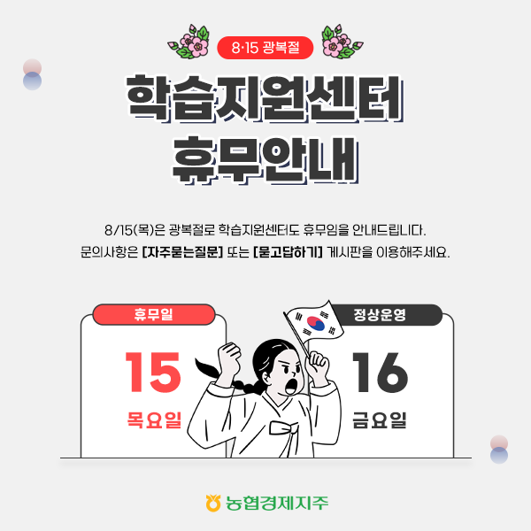 8월 15일 광복절, 학습지원센터도 휴무임을 안내드립니다.
